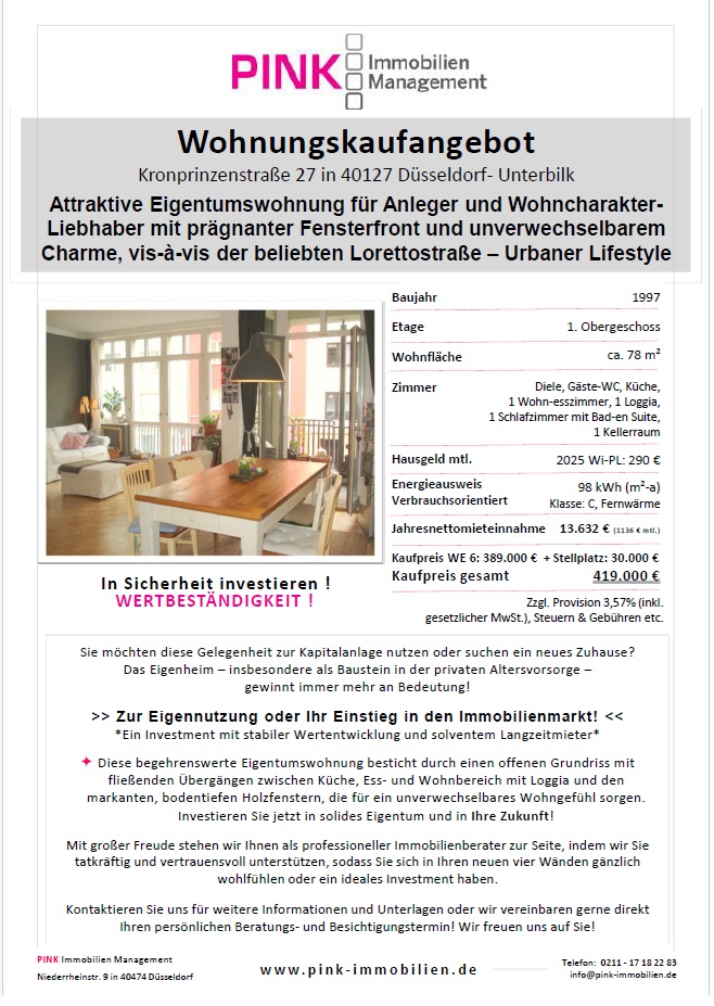 Nutzen Sie den Standortvorteil der florierenden Landeshauptstadt Düsseldorf und sichern Sie sich jetzt diesen citynahen Wohn(t)raum in einer der begehrtesten Lagen der Stadt.