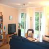 Wohnlicher Mittelpunkt bildet das helle Wohnzimmer mit hochwertigem Eichenparkett und großen Fenstern, die den Blick in den Garten öffnen.