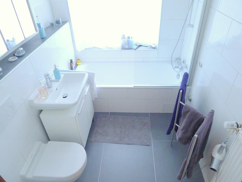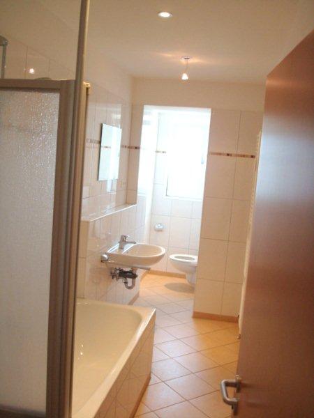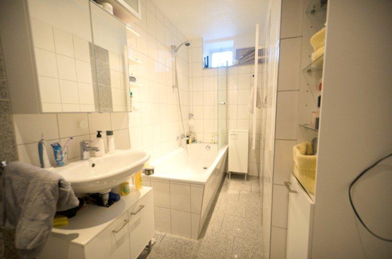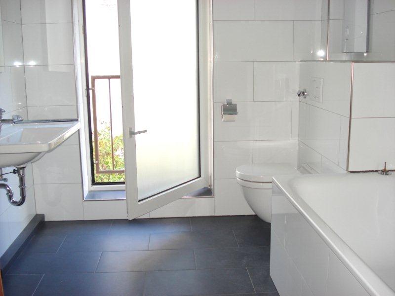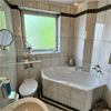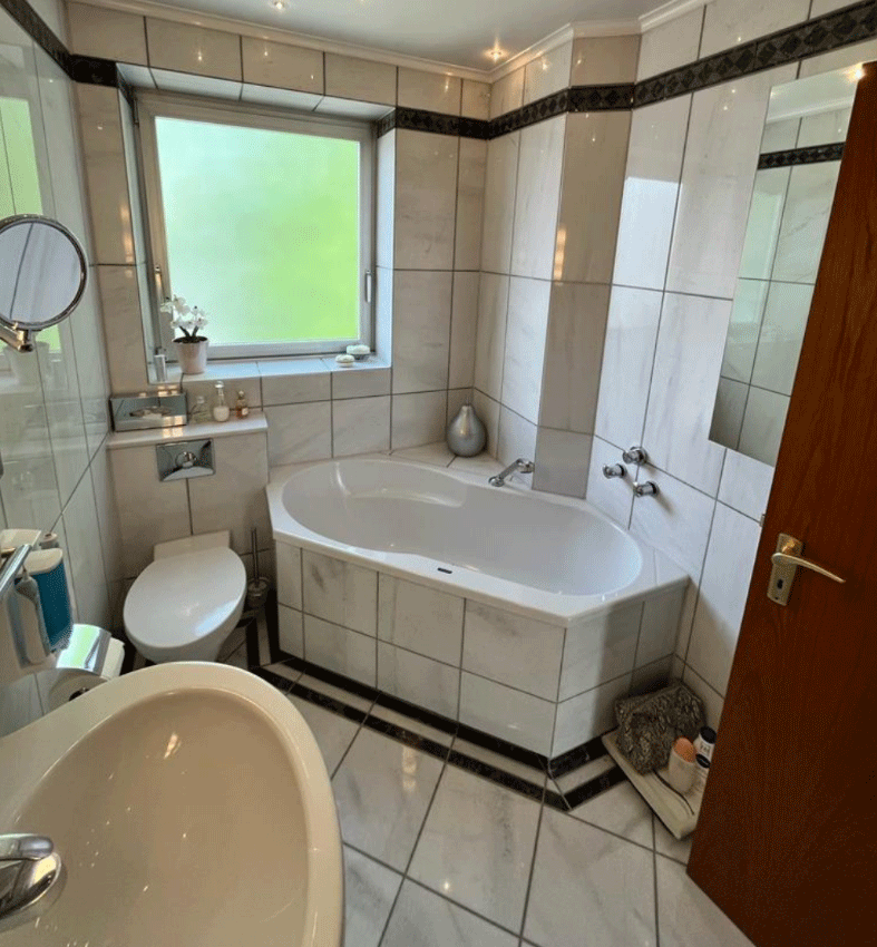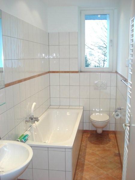 Das modernisierte Wannen- Badezimmer mit großem Fenster verfügt auch über einen Anschluss für die Waschmaschine. Sie können gleichwohl auch im Gemeinschaftswaschkeller des Hauses waschen und den vorhandenen Trockenraum für Ihre Wäsche nutzen.