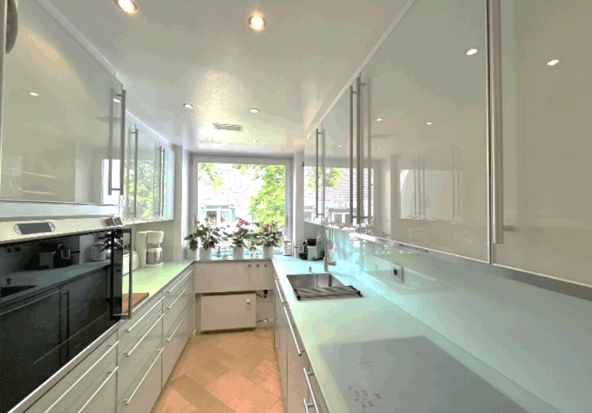 Begeistern wird Sie auch die attraktive und geräumige Küche Wohnküche mit Einbauküche, Tresen und Essbereich, die fließend in das Wohnzimmer übergeht.
