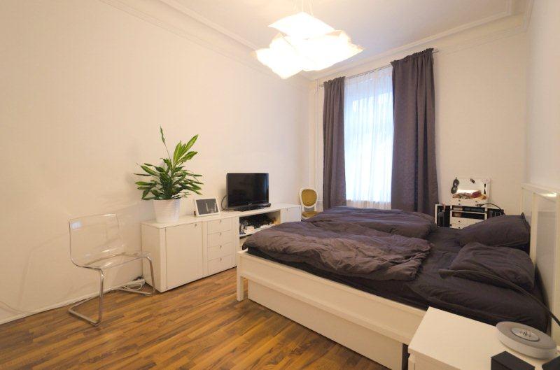 Ein weiterer Blickfang der Wohnung ist das geräumige Schlafzimmer mit Parkettboden und bodentiefe Fenstern sowie das angrenzende moderne Badezimmer mit Fenster, Badewanne und großem Waschtisch.