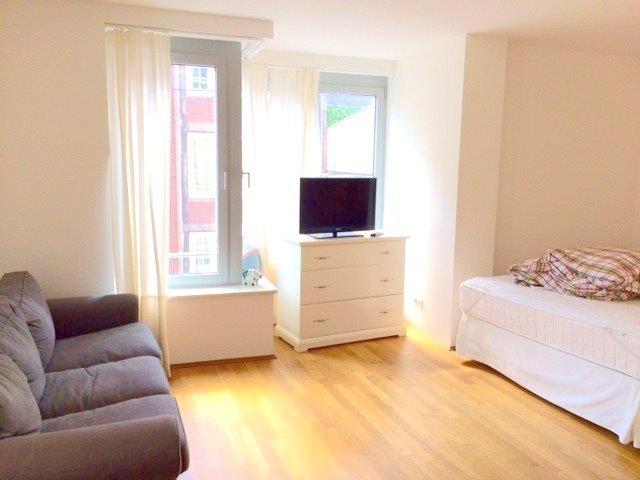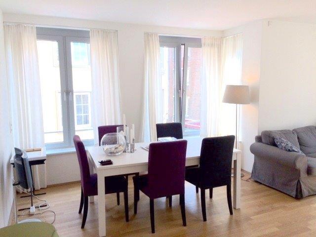 An Ihre geräumige, lange Diele mit viel Platz schließt das Apartment mit seinem großen Wohnraum an. Hier lässt sich Ihr Wohn- Ess- und Schlafmobiliar individuell einrichten und die große Fensterfront öffnet den Blick über die Altstadtgassen.
