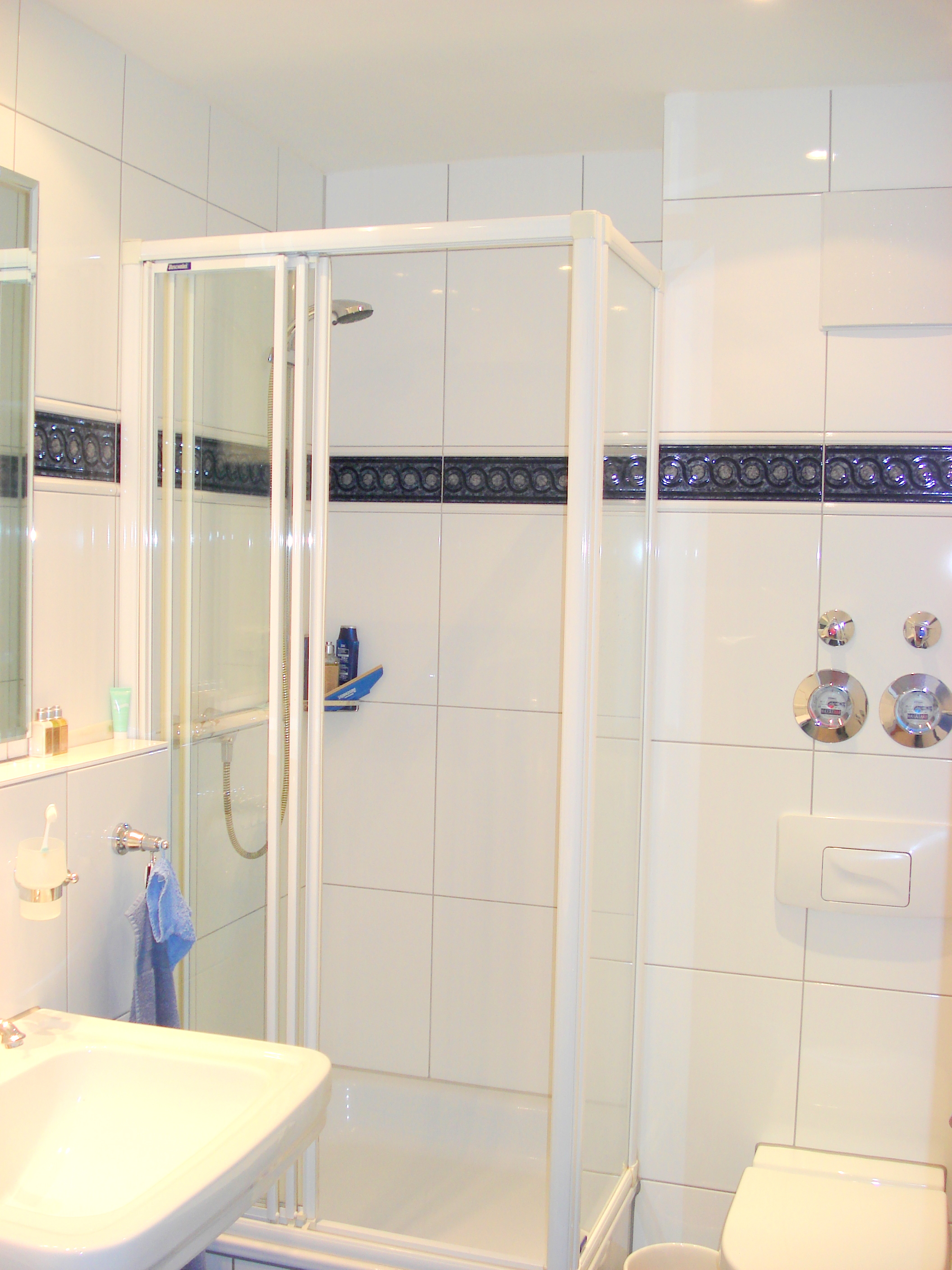 Das anspruchsvolle, hell geflieste Duschbad mit WC und dunklem eleganten Granitboden verfügt über einen Waschmaschinenanschluss.