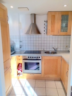Die Wahl moderner Fliesenelemente in Küche und Bad sowie des hochwertigen Eichenparketts in den Zimmern und der Diele überzeugt den anspruchsvollen Mieter.