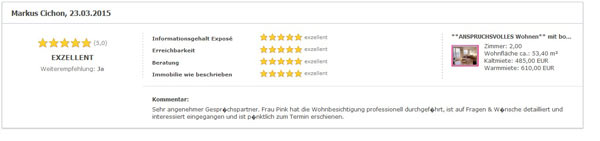 Auch freue ich mich, dass mein persönlicher Eindruck von Ihrer Arbeit – und der ist maßgebend für die Entscheidung meine Wohn-Immobilien immer durch Sie anbieten zu lassen – von professioneller Seite bestätigt wird.