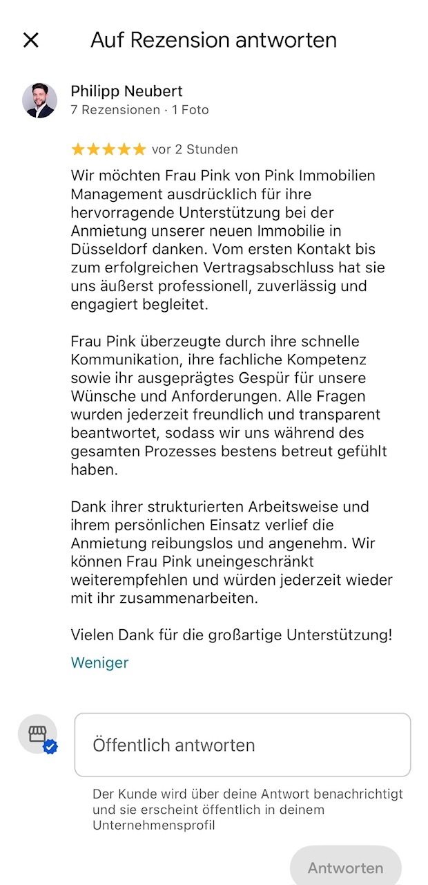 Dass PINK Immobilien innerhalb weniger Tage in der Lage war, mir genau das zu zeigen, was ich suchte, war fantastisch. PINK Immobilien hat mir in vielerlei Hinsicht geholfen und weit mehr getan als das, was zu den üblichen Aufgaben eines Maklers gehört. Dank Frau Pinks Professionalität und ihrem engagierten Team war es bei mir ein voller Erfolg. Besonderer Dank geht an Frau Pink für Ihre Bemühungen und Ihren After-Rent-Service.